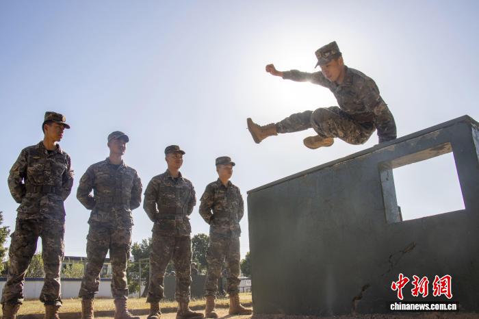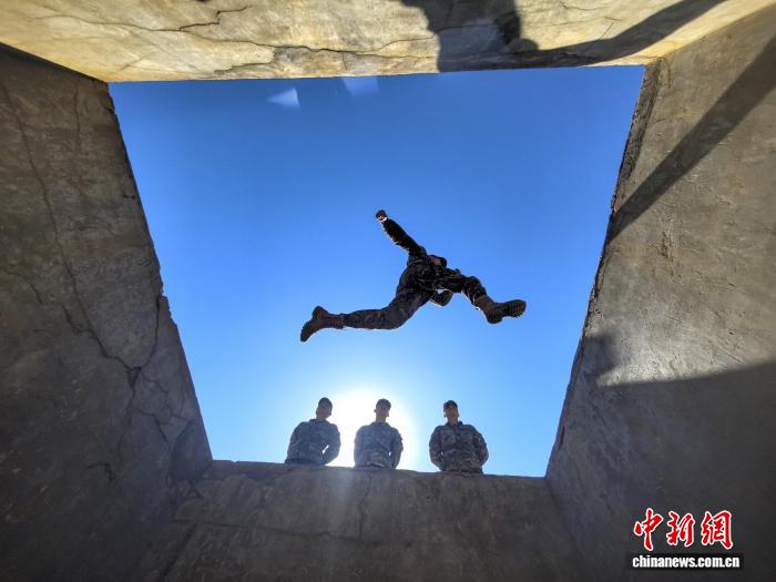 图为武警民卒齐力奔腾矬墙。刘朝 摄